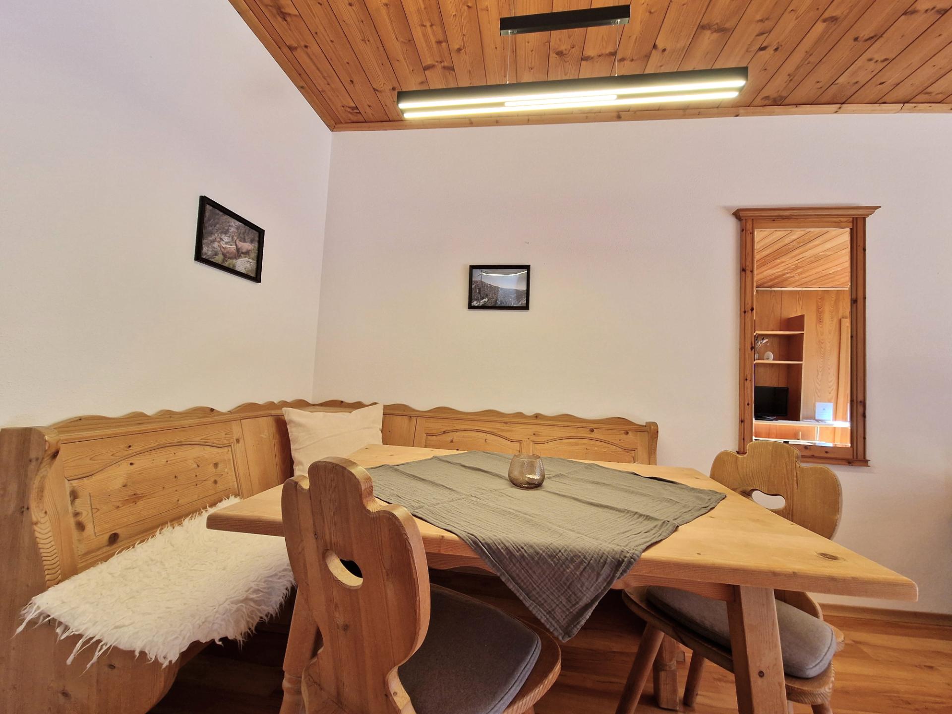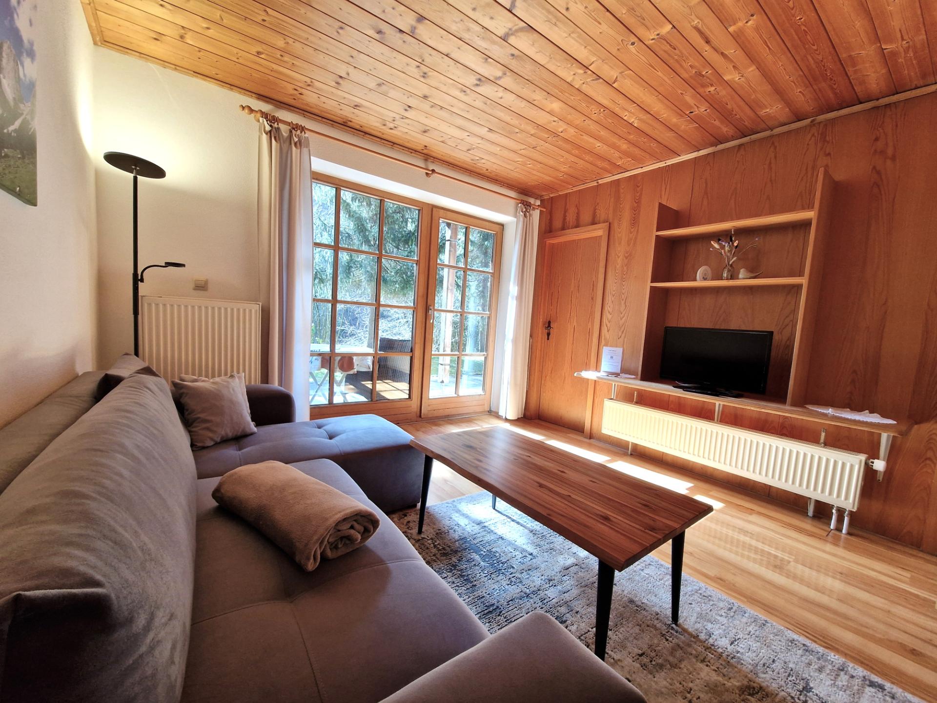 Die ca. 50 m² große, gemütliche Ferienwohnung überzeugt mit einem einladenden Wohnbereich, der durch warme Holzelemente und große Fensterfronten eine freundliche Wohlfühlatmosphäre schafft.